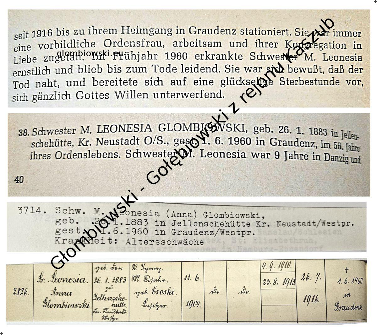 Śp. s. Anna Głombiowska, siostra M. Luminoza, 26.01.1883–01.06.1960. Zgromadzenie Sióstr św. Elżbiety. Do klasztoru we Wrocławiu wstąpiła 1904. Profesja wieczysta: 10.10.1916. Pochodzenie: Jeleńska Huta. łac. luminosus - 'jasny, widoczny, świetlany'. Luminoza (Luminosa) z Pawii (Włochy) rodzona siostra św. Epifaniusza (+496), dziewica, święta Kościoła katolickiego. Mysteria luminosa - Tajemnice światła - Różaniec Od 1916 r. aż do powrotu do domu przebywała w Graudenz. Zawsze była wzorową kobietą religijną, pracowitą i z miłością oddaną swemu zgromadzeniu. Wiosną 1960 roku Siostra M. Leonesia poważnie zachorowała i cierpiała aż do śmierci. Świadoma zbliżającej się śmierci, przygotowywała się na błogą godzinę umierania, całkowicie poddając się woli Bożej.